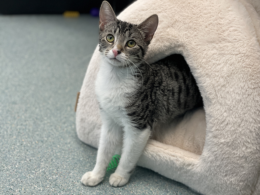 The sweet little sister! Dory adores gentle affection and loves to follow you around, always ready for a cuddle. Her playful side shines through during games with her brothers, but she’s happiest curled up in your lap or nuzzling your hand. If you want a loving, gentle kitten, Dory is the one for you!